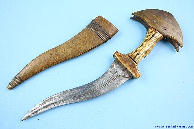 This Khanjarli dagger comes from India, 18 C. The double edged re curving blade is 7 inches long, well forged. Six sectors Ivory grip with a wide lunette shaped pommel (An old but later horn replacement).Wood scabbard. Total length 11 ½ inches. Very good condition. Good dark age patina on the handle Losses to the scabbard. A scarce item. |