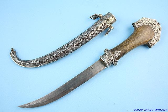 Up for sale is this fine Koumaya Dagger from Morocco. Classical blade of good quality, 9 inches long, double edged at its lower half and single edged at the top. The handle is carved from a single massive piece of Rhino horn with a very clear fibrous structure mounted with chiseled silver pommel cap. Heavy silver scabbard, chiseled with classical Moroccan floral design with Arabic inscription on the back. Total length 17 1/2 inches. Very good condition. |
