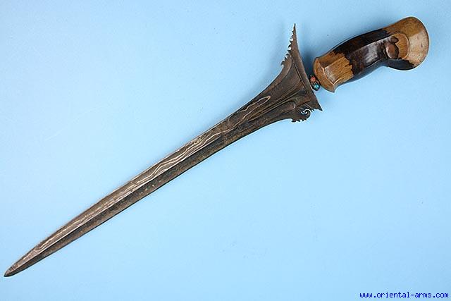 This very good Keris sword is coming from Bali, late 19 C. Finely forged pamor blade with polished black and white pattern 18 inches long. Wood handle of classical form. Mendak set with colored stones. Total length 23 inches. Very good condition.