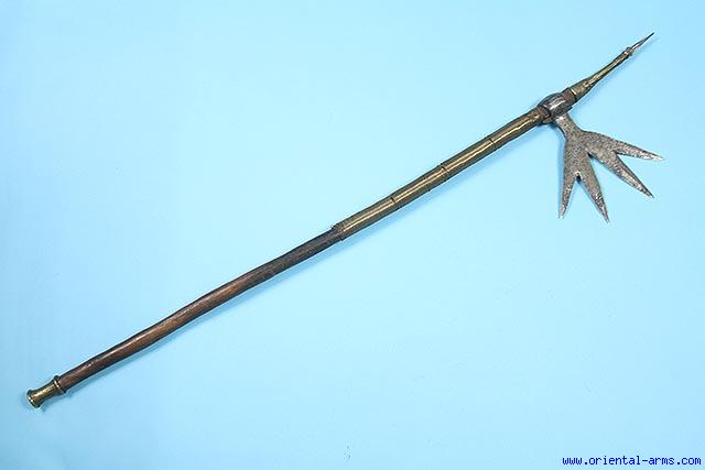 The BULLOVA is the traditional fighting axe of the Chota Nagpur aboriginal tribes of central India. It comes in a variety of blade shapes and this one has a doubled fork blade, 7 inches long, hand forged. It is mounted on a long dark wood shaft 33 inches long bound with brass bands and mounted with a brass spike at the top of the haft. Total length 40 inches. Good condition. Age cracks. |