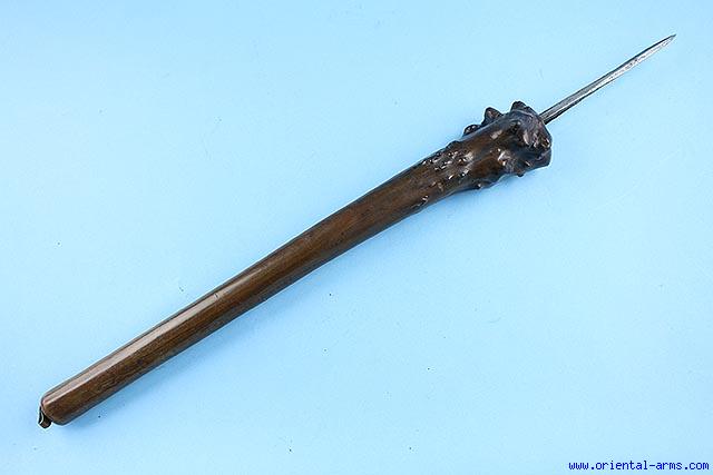 This wood club is most probably a version of Irish Shillelagh, late 19C. It is made of hardwood with swollen head and contains a short blade which is withdrawn by swinging the club. The blade has a spring catch to hold it firm in open position. Blade 5 1/2 inches. Length 16 inches with the blade closed. Very good condition. Very good age patina on the wood |