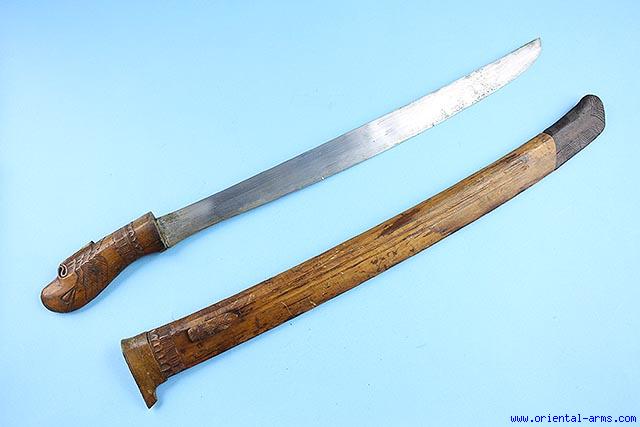 This sword is coming from Java, Indonesia, late 19 – early 20 C. 17 inches finely forged massive blade, of good thickness. The handle is beautifully carved wood with the pommel in a shape of a Mythological creature. Original wood carved scabbard. Total length 26 inches. Very good condition. Very minor wood chips on the scabbard. |
