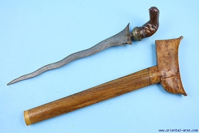 This very good Bugis Keris Dagger has a 12 Wavy blade with clear pamor structure. The mendak is brass. Classical Bugis hilt and the scabbard carved from grained wood. Total Length 17 inches. Very good condition.