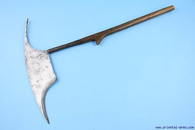 The most known weapon associated with head hunting of the Filipino tribes is the Head Axe. It is characterized by its specific blade shape with the long rear projection. Beside warfare, It was also used as a multipurpose cutting tool, worked in a very peculiar way: The long rear spike was driven in the ground, holding the axe in place edge up, and the cut object was drawn along the edge. We offer here for sale a very good example used by the people of Kalinga (?) tribe. Early - mid 20 C. 14 inches blade (Point to point) with concave edge and 4 inches long socket. 13 inches wood haft with brass wires inserts. Very good condition. |