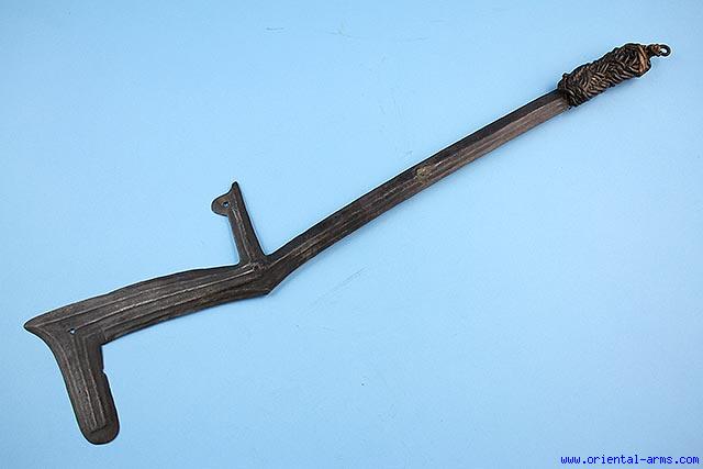 This rare form of throwing knife is used by the Gbaya people residing in Cameroon and Central African Republic. It is 26 inches long, forged from good steel with ribs on its front face. Handle of finely braided leather strips. Early - Mid 20C. Very good condition. Nicely patinated. Minor edge nicks. |