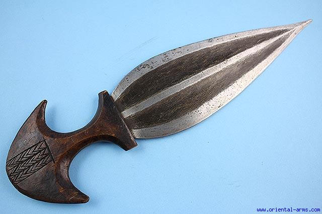 Up for sale is this very good quality dagger of the Lobala people from Northern Zaire. Very typical in the blade shape and big wood handle with flared pommel. The blade is 11 inches long; spearhead shape with a central shallow rib and with the original blackened patina. The wide handle is 5 inches wide. Total length 16 1/2 . Very good condition. |