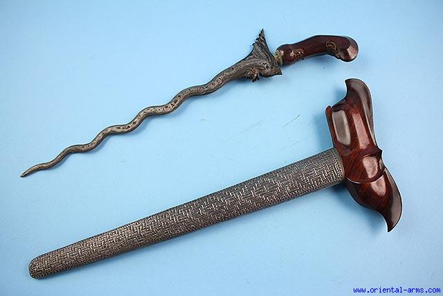 Up for sale is this fine Naga Keris from Java. Last quarter of the 20C. The Naga (serpent) finely chiseled on the blade represent a Mythological snake and empower the Keris with great power. 13 inches long wavy blade of very good pamor structure. The central line representing the Naga body ends up at the blade top with beautifully chiseled head open mouth and extending fangs. Fine grained wood grip of classical Java style with silver mendak. Grained wood scabbard with finely chased silver cover. Very good condition. |