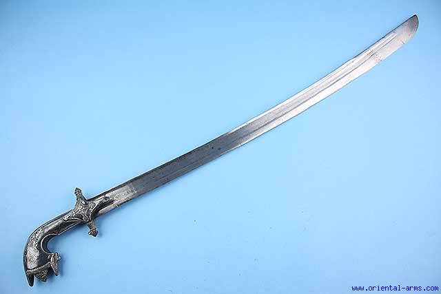 This Saif is a rare version of Arab saber from the South Arabian Peninsula. A fine heavy sword, with a 31 inches long single edge blade with a T spine and 7 1/2 inches back edge. The hilt and cross guard are whole silver in a typical form reminding in a way the hilt of the Moroccan Nimcha sword. Total length 36 inches. Very good condition. No scabbard. A fine piece. |