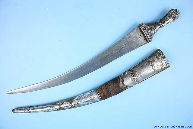 This type of long Jambiya dagger is common in the Western regions of Arabia, Hijaz and Asir. Sometimes it is referred to by collectors as Wahabite style. The one offered here is of good quality , the blade is plain, high carbon steel, 17 inches long. The grips are horn with heavy granulated silver. The scabbard is wood with big engraved silver / iron locket, and brass / silver chape. Total length 23 inches. Very good condition. small pitted areas on the back of the scabbard. |