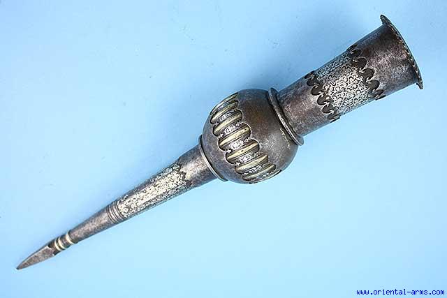 This old and massive spear tail is Indian, South India (or Deccan) late 17C. or early 18. 17 inches long, whole steel with silver inlay decoration and brass inserts. Very good condition to age. Rare find