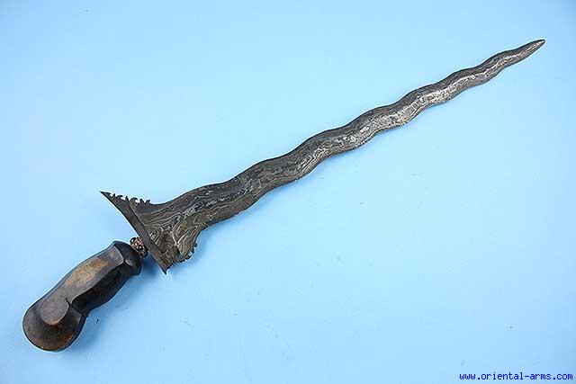 This very good Keris sword is coming from Bali, late 19 C. Finely forged pamor blade with polished black and white pattern and of rather large size, 19 inches long. Wood handle of classical form. Mendak set with colored stones. Total length 24 inches. Very good condition. |