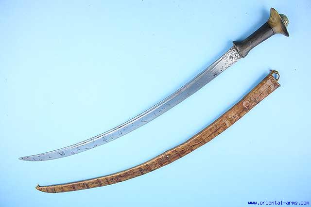 The Ethiopian saber, also known as Gurade characterized by a curved single edge blade and mounted with typical Ethiopian horn hilt. This specific one has a 28inches long fullered blade The hilt is made of two horn sectors the lower one carved from Rhino horn. The pommel cap is dome shaped engraved brass. Original scabbard covered with tooled leather. Total length 36 inches. Very good condition. Lightly chipped grip. Minor losses to the scabbard. |