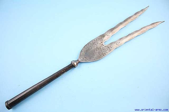 This spear head is Persian, late 19 - early 20 C. Qajar period. Double blade 14 inches long, finely chiseled. Total length 23 inches. Very good condition.