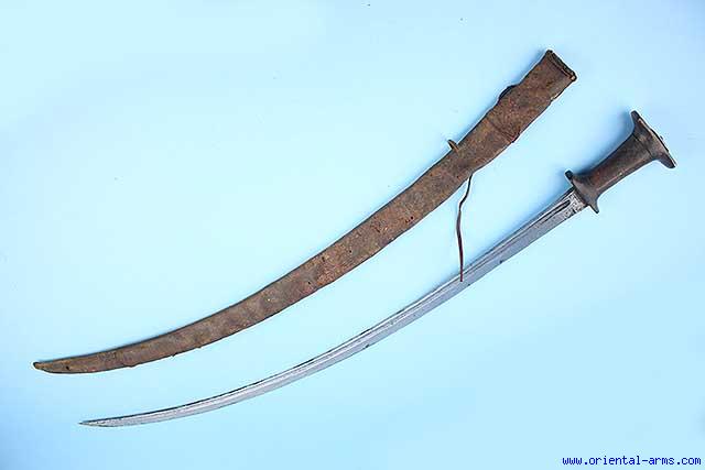 The Ethiopian saber, also known as Gurade characterized by a curved single edge blade and mounted with typical Ethiopian horn hilt. This specific one has a 34 inches long fullered blade The hilt is made of three rhino horn with a brass pommel cap. tooled leather scabbard. Total length 40 inches. Very good condition. Minor losses to the scabbard. |