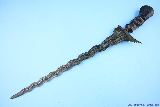This fine Keris sword is coming from Bali, late 19 C. Finely forged pamor blade with polished black and white pattern and of rather large size, 20 inches long with a pronounced central rib. Wood handle of classical form. Mendak set with colored stones. Total lenogth 25 inches. Very good condition. |