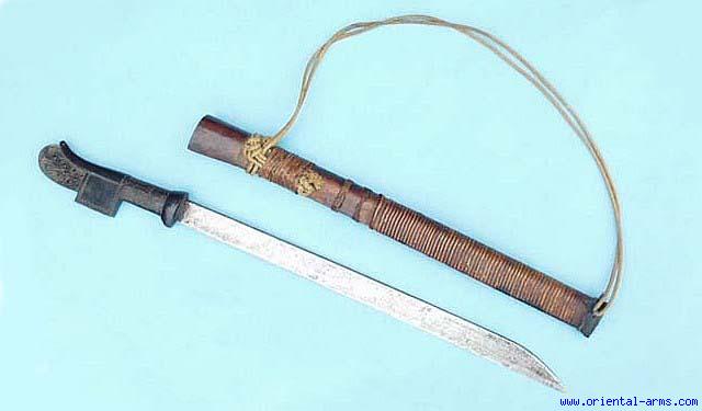 We offer for sale this very rare sword coming from Toraja (The central mountainous region of Sulawesi). It is locally called: Dua Lalan meaning dual purpose, to describe its use, both for war time and for ceremonial slaughtering of Buffalo. It has an 18 inches heavy blade, pamor forged, a black horn handle and wood scabbard bound with rattan. Total length 25 ½ inches. Very good condition, some minor damage to the rattan binding of the handle. Similar swords can be seen inAlbert G. Van Zonneveld, Traditional Weapons of the Indonesian Archipelago , Page 43. An excellent and rare sword. |
