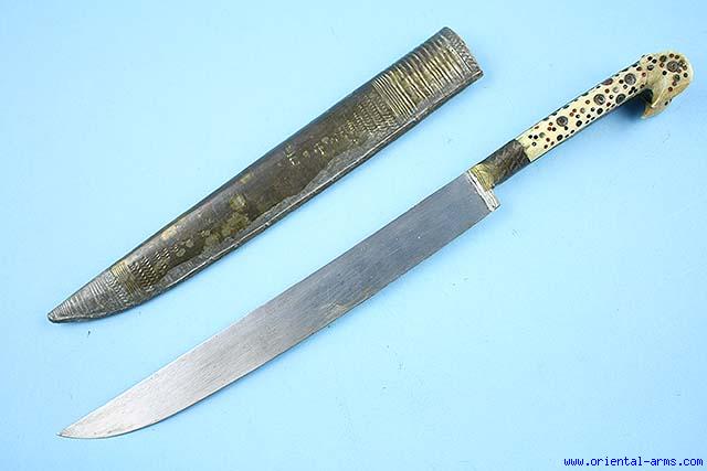 A typical knife from Bosnia & Herzegovina, from the very short period of independence before the annexation to the Austro-Hungarian Empire at the end of the 19th C. The blade is straight, single edge, 9 1/2 inches long. The grips are bone with flared pommel, set with brass nails and inserts in a typical Balkan style of decoration. The scabbard is wood covered with thin chased brass. Total length 14 1/2 inches. Very good condition. Very Low Price. |