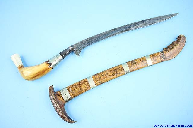 A very good RENTONG knife / dagger from the Malay Archipelago. The version offered here is mostly used by the Achenese people from North West Sumatra . The blade is massive, 10 inches long down curving and single edged, forged from laminated steel. The hilt is most probably Hippo tooth, with sharply up-curving pommel (with a later replaced ivory tip to repair an old breakage). The scabbard is finely engraved wood with white metal reinforcing bands. Total length 17 inches. Very good condition. |
