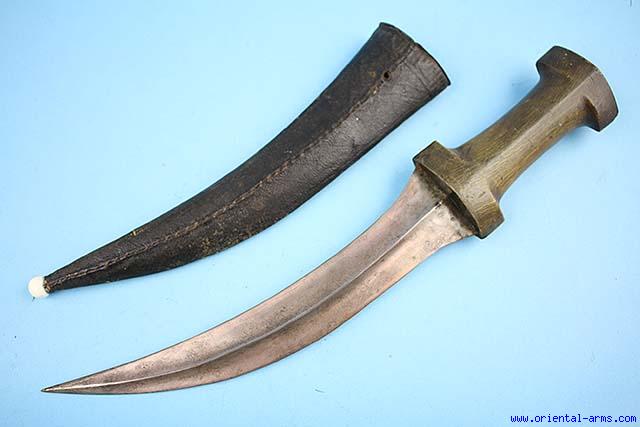 Up for sale is this Turkish Khanjar dagger, last quarter of the 19 C. Very good solid blade of typical dual edge curved shape with a pronounced central rib. Solid horn handle and leather covered scabbard with a bone tip. Blade length 10 inches, total 15. Very good condition. |