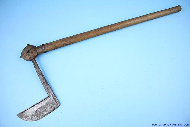 This peculiar shaped axe is a fighting ax of the Sefuko people residing in Ivory coast, Mali and Burkina Faso. Early - mid 20C. Well forged blade with shallow fuller, 6 inches long. The 6 inches tang is perpendicular to the blade. Engraved wood haft. Total length 30 inches. Very good condition. |
