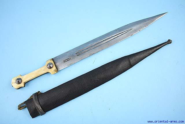 This Qama dagger is most probably Georgian, late 19. Classical shaped blade double fullered with maker mark in Arabic letters, 12 1/2 inches long. Bone and horn handle. leather covered scabbard. Total length 20 inches. Very good condition. The leather cover is a later replacement. |