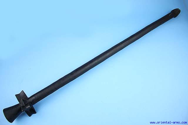 Up for sale is this wooden club from the New Hebrides - A lethal weapon in the experienced hand. Early 20C. Flanged "Teeths" with a conical head above it. 43 inches long carved from a beautiful dark hardwood. Very good condition. Very minor chips of wood. |