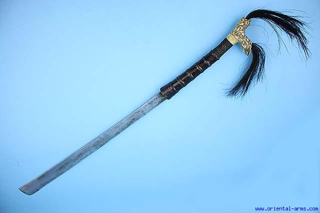 Up for sale is this unusual combination of what looks as a Dao sword with a Mandau style handle. All looks authentic. Heavy blade 23 1/2 inches long. Bamboo (?) two handed handle ending with a classical L shaped bone handle decorated with hair tufts. Total length 34 inches. Very good condition. No scabbard |