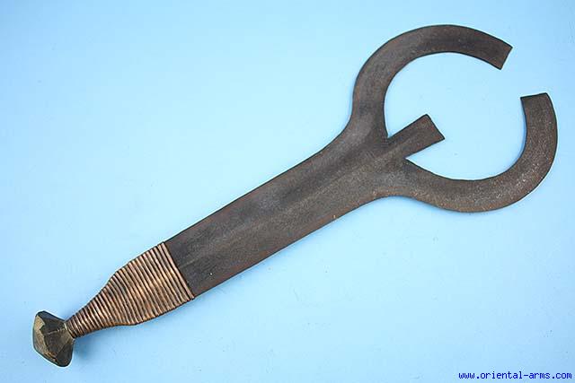 This sword is common between the Lobala / Ngbaka people of central Zaire. There are many legends concerning the use of this type of sword for execution. Either it is right or wrong, it is definitely a very impressive sword and always was regarded as a symbol of status. This one is of the double blade form, 20 inches long very well forged blade. The hilt is wood. The hilt top and the blade base are bound with copper strips. Very good condition. Original blackening of the steel. Minor wood chip on the pommel knob. Very Impressive sword. |
