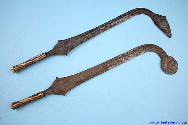 These two knives are most probably Yakoma and made for display of high position and status. Sickle shaped blades 13 inches long ending with widened tips. Wood handles with copper binding. Total length 17 inches. Very good condition. Good patina on the blade. Mid 20C. |