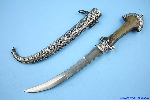 This Moroccan Koumaya dagger is a fine exemplar, 20C. vintage. Very well forged blade 9 inches long. Rhino horn grip with silver mounts. Heavy silver scabbard finely chased. Total length 16 inches. Fine condition.