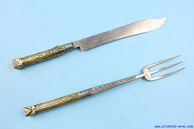 This eating set is Moroccan or Algerian, early 20C. or earlier. It comprises of a knife and fork, steel blades and brass handles decorated in a style reminding a flyssa sword handle. Length 10 1/2 inches. very good condition.