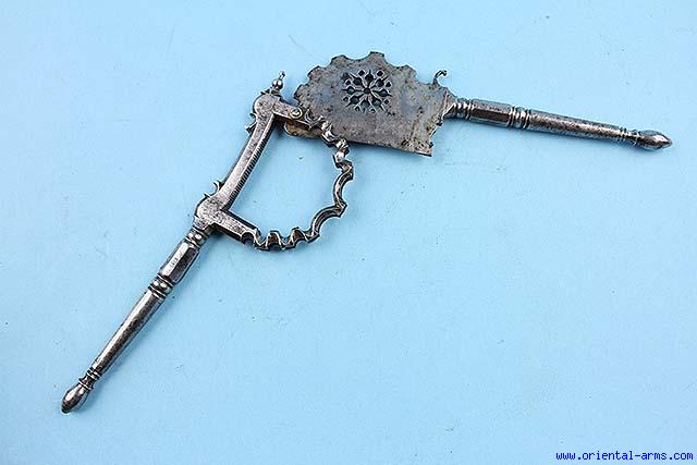 Not exactly a weapon but a good example of early iron work from India. This betel nuts cutter is late 18 C. or earlier, most probably Deccan. Whole steel work, finely chiseled and pierced. Total length 7 ½ inches. Very good condition.
