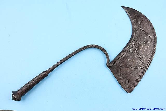 This peculiar shaped sickle shaped axe is coming from Nigeria, Verre people. Well made ceremonial piece but very functional as well as weapon. 11 inches long 4 inches wide blade mounted on a steel haft and steel handle bound with steel strip. Total length 19 inches. Very good condition. Original patina on the blade. Unusual and scarce item. Early 20C. |