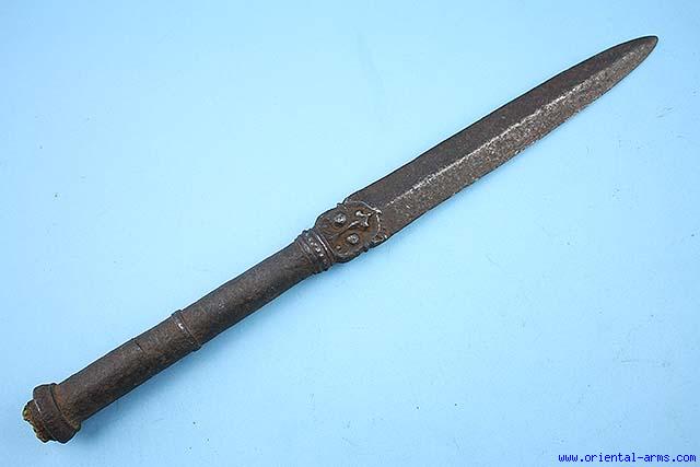 Up for sale is this early spear head, 17C. or earlier. South India or Deccan. 10 inches blade finely chiseled at the base. steel socket. All forged in one piece of steel. Total length 17 1/2 inches. Good condition to age. Moderate pitting. Age crack in the socket. |
