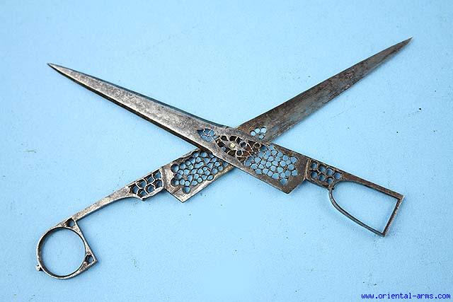 Not exactly a weapon but a very fine example of Persian steel craft. This scissors are Persian, 19 C. also known as Qalamdan. and are used to cut paper rolls to the needed size. Hollow ground blades and finely pierced handles. Length 7 inches. Very good condition. For a similar items see James Allan & Brian Gilmor Persian Steel – The Tanavoli Collection Page 353. |