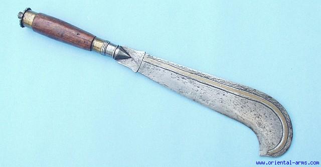 This small Ram-Dao is a sacrificial Knife from Nepal. It is meant to behead sacrificed doves and other small birds in one sword blow, and this is exactly how the blade is designed: Heavy, 9 inches long, down curving blade with wood handle 5 inches long, all in the shape of its bigger brother Ram Daos used to sacrifice bigger animals. The blade is decorated with geometrical engraving and inlaid with brass decoration just below the spine. grip is turned wood is fitted with brass mount and a steel pommel. The blade has small areas of light superficial pitting but otherwise in very good condition. |