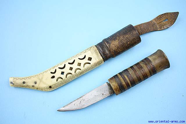 This Scandinavian Puukko knife is late 19 - early 20 C. item, with a short heavy and sturdy blade, 4 long signed J.L.S. Bone grip with leather disks separators. The scabbard is made of bone, two halves longwise with leather locket and delicately engraved. Total length 11 inches. Very good condition. Very good age patina on the handle. |