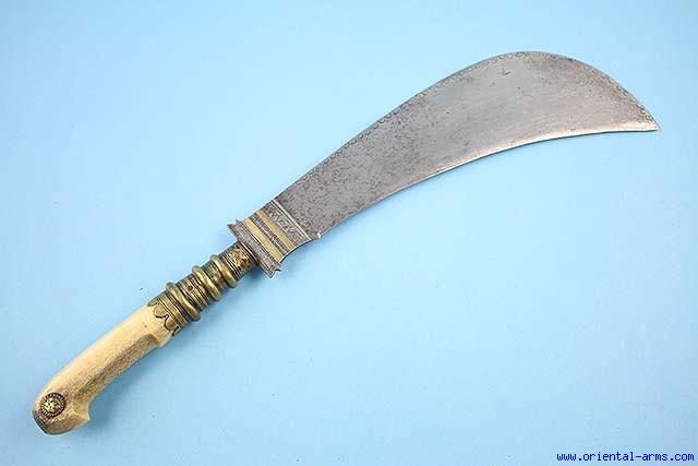 The Moplah is the sword of the Coorg people from the Malabar coast of south west India. A rare item. 12 inches long 3 inches wide blade, stamped along the spine with the Eyelashes mark and with brass inserts at the base. The handle is bone with brass collars. Newly made wood scabbard. Total length 19 inches. Very good condition. |