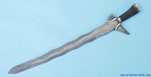 This is a very good and old Moro Kris, probably early 19 century. The wavy blade is 19 ½ inches long, constructed from a laminated core, welded between high carbon steel edges and well treated and heat hardened. The grip is bound with fibers and mounted with engraved silver rings. Bone / horn combination flat pommel. Two silver clamps secures the blade to the handle. Total length 24 inches. Good condition. Light scratches and minor battle scars on the blade edges. The grip is very slightly loosed but holds in position. Old grinding damage near the tip of the blade. No scabbard. Excellent sword. |