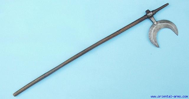 The BULLOVA is the traditional fighting axe of the Chota Nagpur aboriginal tribes of central India. The blade is of distinct lunette shape (unusual) hand forged steel. It is 5 ½ inches tip to tip. It is mounted on a dark wood shaft through its heavy socket, secured in place by this steel sheet below the axe socket. Very good condition. Minor edge nicks. attractive price. |