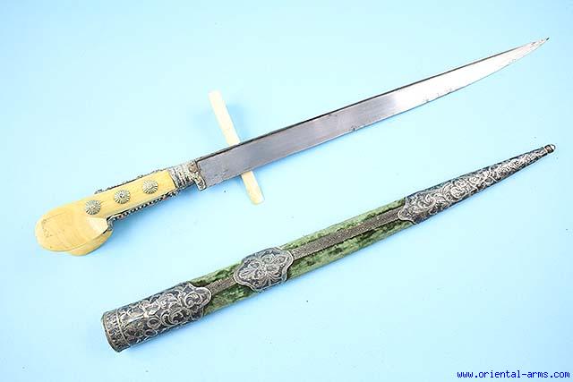 This style of short Yataghan sword is sometimes known as Marine Yataghan, probably because of its length. In contrary to more common Yataghans the blade here is short, straight with a pronounce T spine. The grips are elephant ivory with very long and narrow ears. The bolsters and grip strap are silver with set with corals and small turquoise stones. Original fabric covered scabbard with chased silver locket and chape. Blade 15 inches. Total length 23 ½ inches. Very good condition. The short bolster may indicate an early repair. |