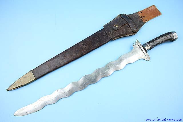 This unusual heavy sword is composed of a Moro wavy kris blade 20 inches long, forged from a laminated core forge welded between high carbon steel edges. Blade 19C. A later European style horn grip with silver mounts was mounted and a military style heavy leather scabbard fitted to the sword. Total length 27 inches. very good condition. massive and impressive sword. |