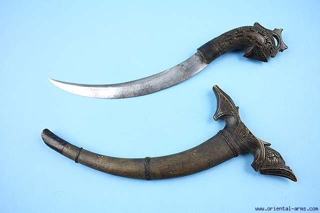 A Korambi style curved dagger from Sumatra, early - mid 20 C. 7 ½ inches deeply curved double edged blade. Finely carved wood handle and scabbard. Total length 12 1/2 inches. Very good condition.