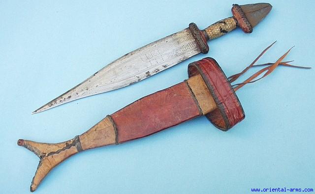 This large arm dagger is coming from the Central Sahara. The blade is 11 inches long, 2 inches wide, ending with acute tip, the grip is bound with reptile skin and the pommel is steel. In a shape of short back edge. Tooled leather scabbard with arm band and fish tail tip. Total length in scabbard 19 inches. Good condition. Few blackened spots on the blade. Very low price . |