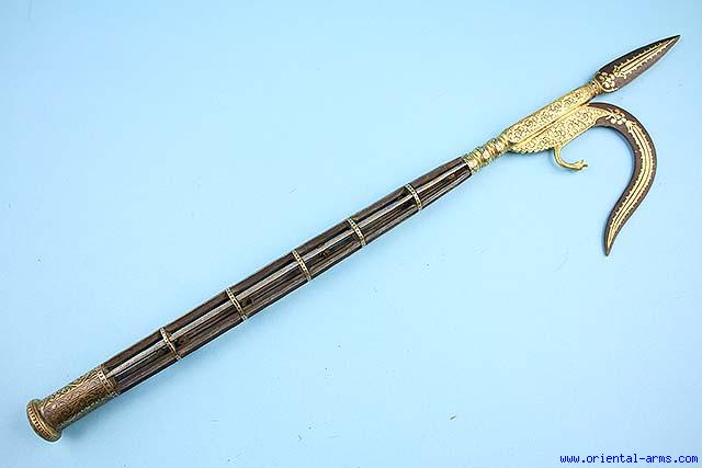 This is an Indian ANKUS, (Elephant Goad), used by to guide the elephants. Although it is not a pure weapon, it is always attached in Museum and private collections to Indian arms and armor. It also finds extended use as a ceremonial item displayed in parades and other important events. This one is a high quality exemplar, made entirely of steel and richly decorated with gold inlay work. Hollow haft with 6 steel balls inside, free to move and ring when the ankus is in use. Length 22 inches. Authentic item dated probably to the late 19th C. |