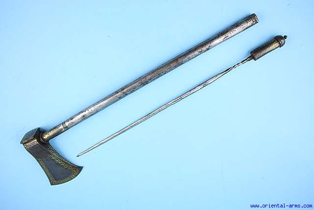 This fine piece is also known as saddle axe, Persian Qajar period early 19C. The heavy blade is 3 1/2 inches wide 6 inches tall, forged from fine high contrast wootz steel. The 22 inches long steel handle is finely etched in a pattern imitating watered steel and includes a concealed long spike. The blade is very richly decorated with gold koftgari work. Very good condition. |