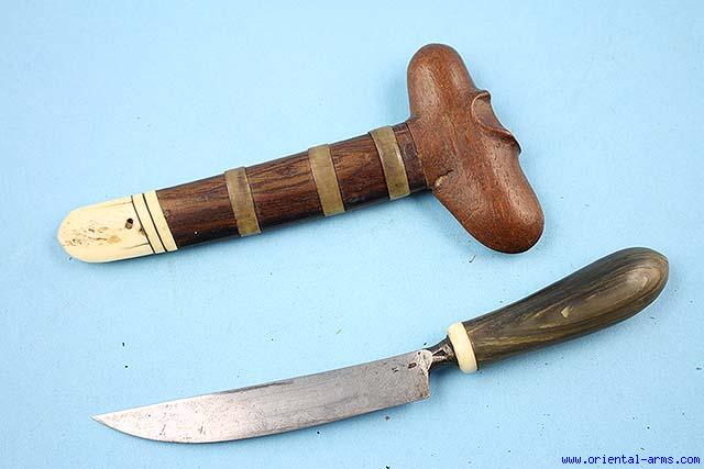 The Siraui is a rare dagger from Sumatra, with a short and curved blade sharpened on its convex edge. Up for sale is this miniaturw exemplar with a 4 inches. The handle is horn.The scabbard resembles a Keris scabbard, wood with bone tip. Total length 8 inches. Very good condition. |