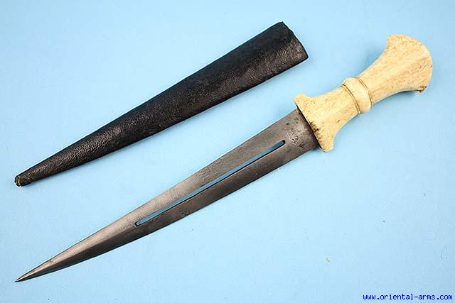 Up for sale is this fine Turkish Dagger with a 9 inches blade forged from very good wootz (Damascus, watered) steel of good clear pattern. The blade is engraved with Arabic letters and dated 155 (standing for 1155) in the Islamic calendar (1742 in the Gregorian calendar). The handle is a solid piece of walrus ivory carved entirely from the marble like inner core of the tusk. Leather covered wood scabbard. Total length 12 1/2 inches. Very good condition. very minor chips on the ivory handle. The leather cover of the scabbard is later. |