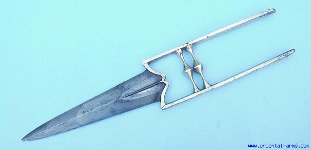 This is a quality 18 Century Armor piercing Katar push dagger, forged from Indian wootz (Crystalline) steel, with a high carbon plain steel armor piercing tip. The blade is 9 inches long, 2 ½ inches wide. The two cross bars provide the holding and the 8 inches side bars protects the fist from a side sword hit. All hilt parts are covered with very thin gilded silver foil. Very good condition. Few very minor pitted spots and minor damaged ara to the silver. |