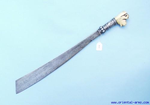 This Parang is coming probably from Borneo. It has a very heavy pamor blade, 17 inches long and more than ½ inch thick at its base. The grip is carved bone mounted with decorated silver collar (very similar in materials, construction and design to the hilt of a Parang Latok # 0388 on this site) |